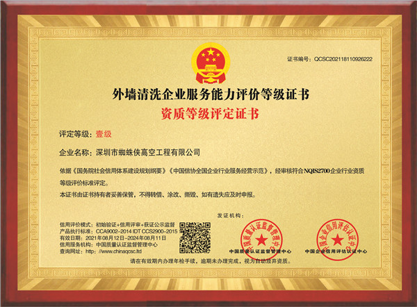 外墙清洗企业服务能力评价等级证书-铜牌